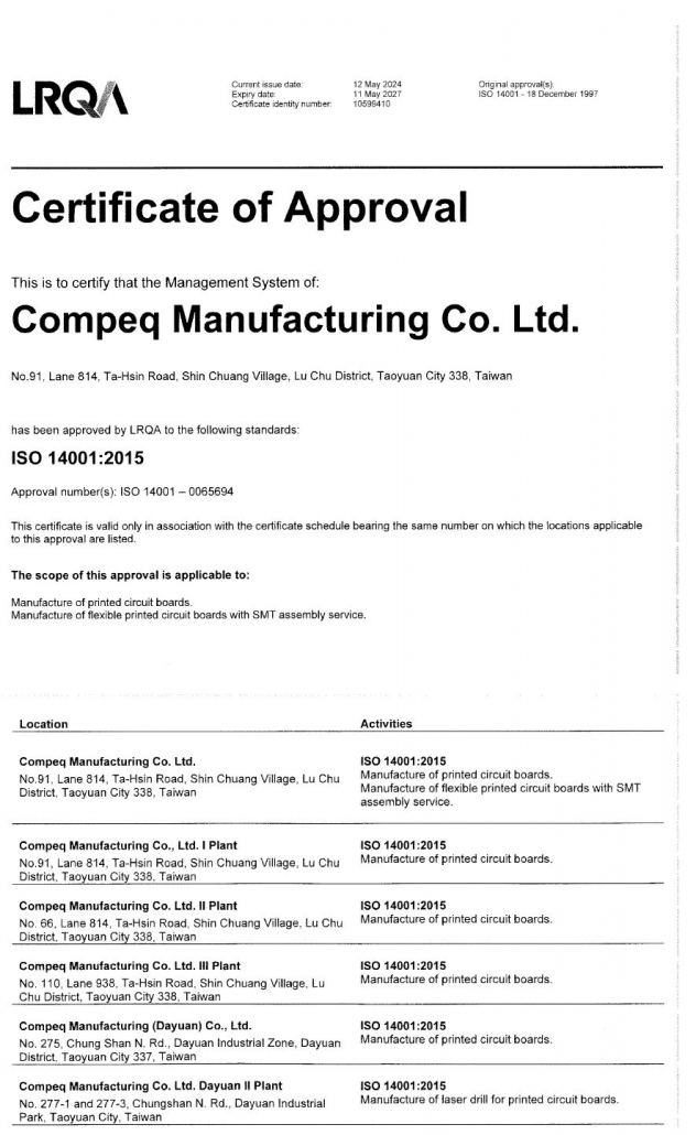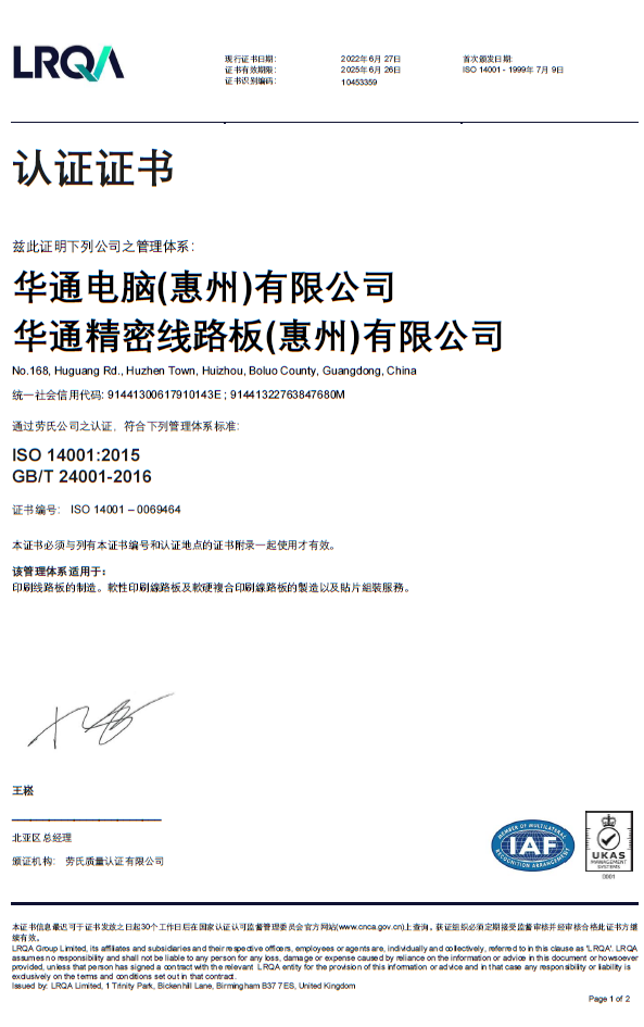 惠州廠-精密線路板ISO 14001環境管理系統(惠州精密廠)
